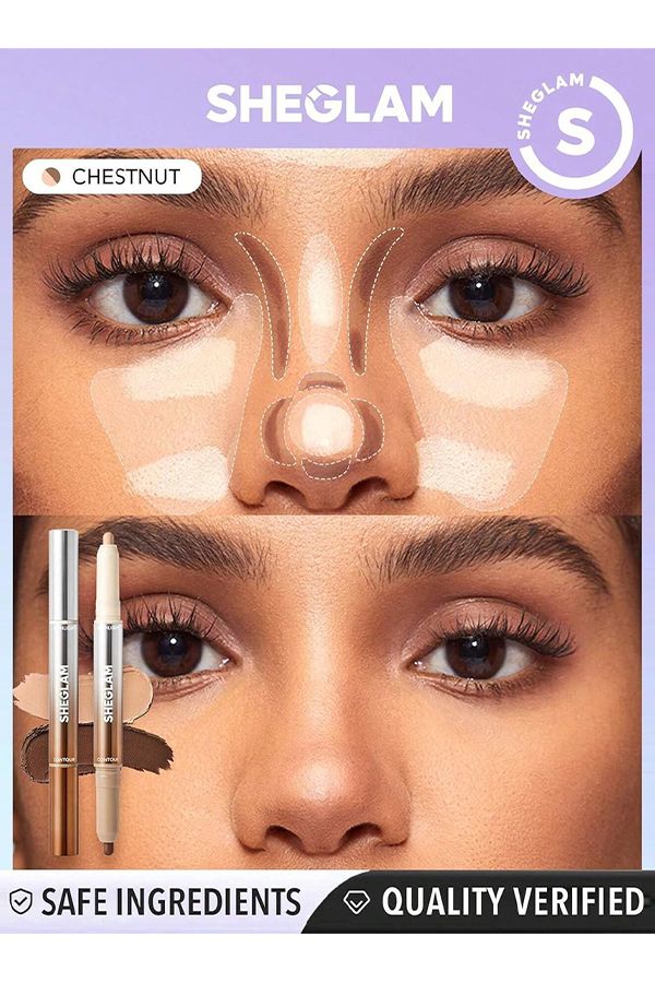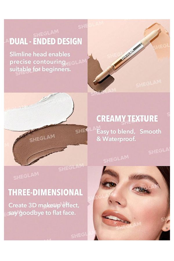 Achieve a smooth and sculpted nose or overall beat in seconds with SHEGLAM's creamy, fool-proof 2-in-1 highlight and contour pen! One end features a thin highlighter tip to help you brighten the bridge or tip of your nose with precision. The other end features a contour tip to help you naturally sculpt your nose. Easily outline and create three-dimensional yet natural-looking contours with just one stroke! Features: - Dual-Ended Design: Slimline head enables precise contouring, suitable for beginners - Creamy Texture: Easy to blend. Smooth and Waterproof - Three-Dimensional: Create 3D makeup effect. say goodbye to flat face - Clean, vegan and cruelty-Free - Free of: Alcohol, fragrance, gluten, paraben, talc, phthalates, sulphates - Recyclable - Size: 0.5g How to Use: - Highlight Head: Apply to your forehead, bridge of nose, under your nose and chin - Contour Tip: Apply to edges of your nose, cheekbones