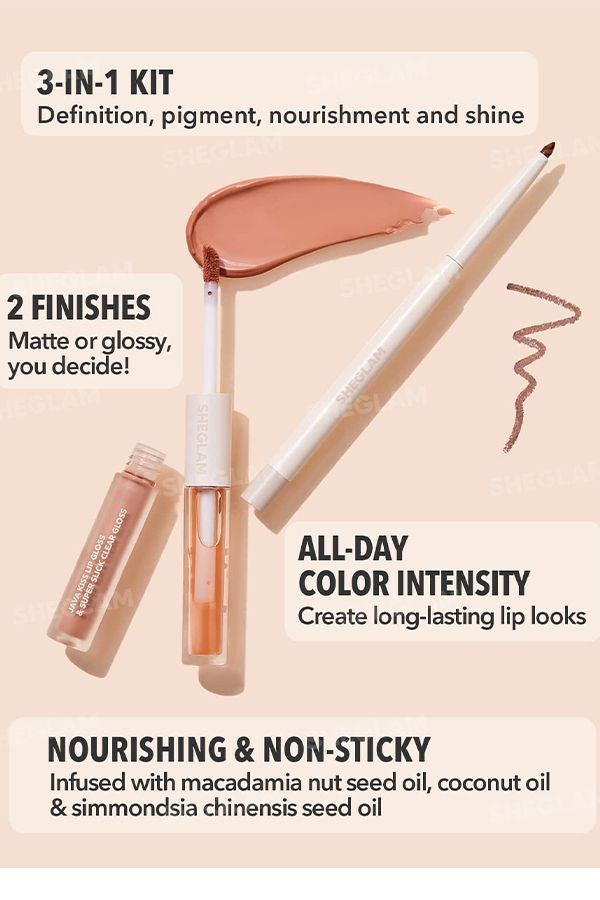 JAVA KISS LIP GLOSS: Matte finish that moisturizes and smooths with a beautiful texture.Long-lasting color that won’t fade.Moisturizes with Macadamia Seed Oil,Coconut Oil,Jojoba Seed Oil,and Shea Butter fade.Vegan and Alcohol Free. SUPER SLICK CLEAR GLOSS: Light gel texture that absorbs quickly and leaves lips moisturized and never sticky,and keeps your lip color base in place.Beautiful high-shine finish with a crystal clear luster and long-lasting hydration thanks to skin-loving ingredients,like Macadamia Seed Oil,Coconut Oil,and Jojoba Seed Oil.Yummy Vanilla fragrance,Vegan and Alcohol-Free. SO 90'S LIP LINER: Smooth and velvety matte finish that doesn't budge.Nourishes lips with plant extracts,like Macadamia Seed Oil,Coconut Oil,Jojoba Seed Oil and Shea Butter.Vegan and Alcohol-Free."
